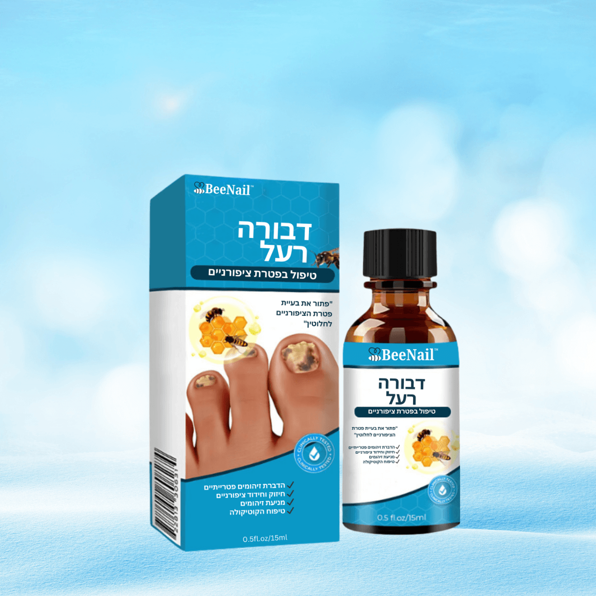 בהחלט! BeeNail™ מתאים לשימוש על ציפורני ידיים ורגליים ומתמודד עם בעיות כמו שבירות, הצהבה וזיהומי פטריה באופן יעיל.