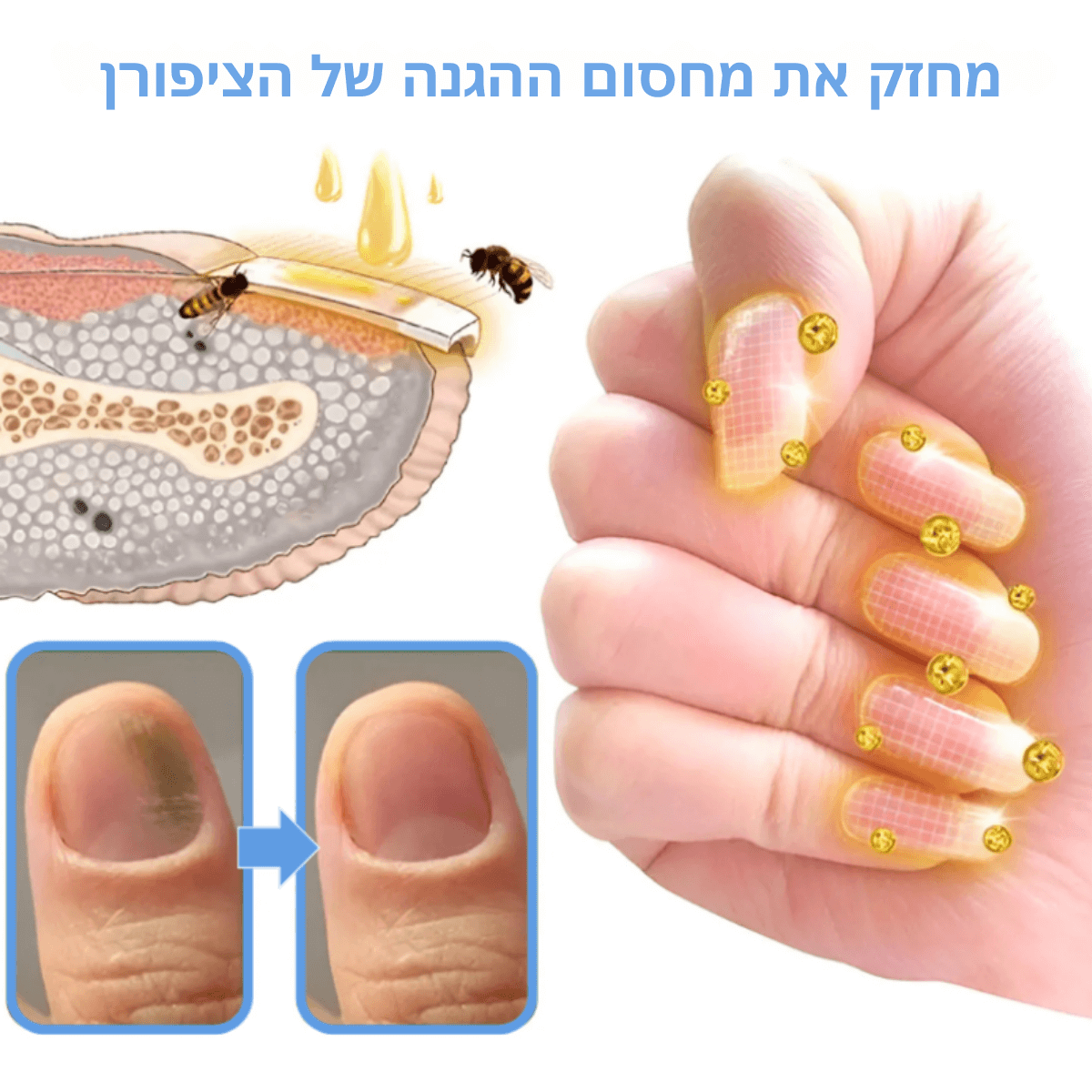 BeeNail™ נעזר בתכונות הריפוי הטבעיות של רעל הדבורה לשיקום וחיזוק הציפורניים מבפנים.